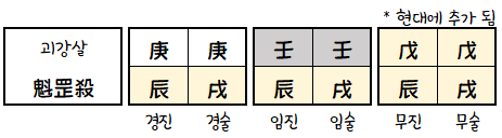 경진(庚辰), 경술(庚戌), 임진(壬辰), 임술(壬戌)을 괴강이라 하는데 현대에 무진(戊辰)과 무술(戊戌)이 추가되었습니다.