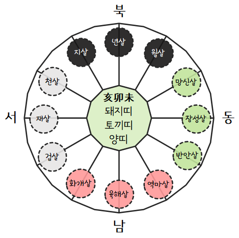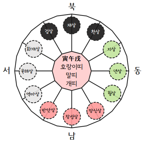 인오술(寅午戌)생인 호랑이띠, 말띠, 개띠는 해(亥)수의 위치인 북북서에서 겁살이 시작됩니다.
