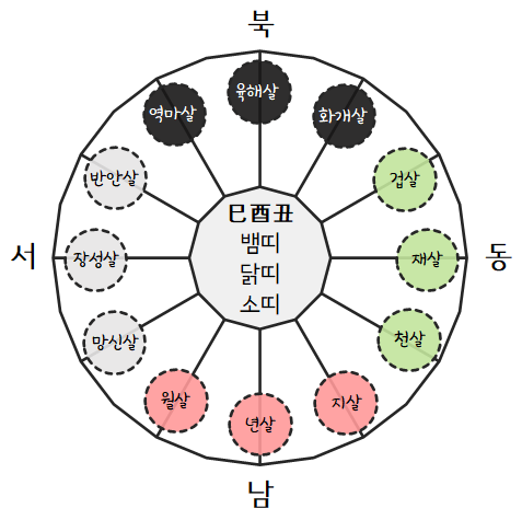 12신살의 방위는 겁재천지년월망장반역육화 순으로 시계방향으로 보면 됩니다.