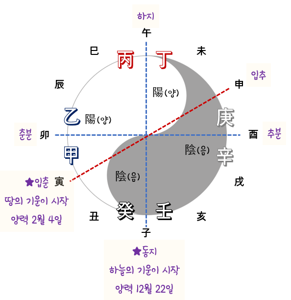 계절적인 음양은 자월(子) 동지부터 양이 시작하고 오월(午) 하지부터는 음이 시작하게 됩니다.