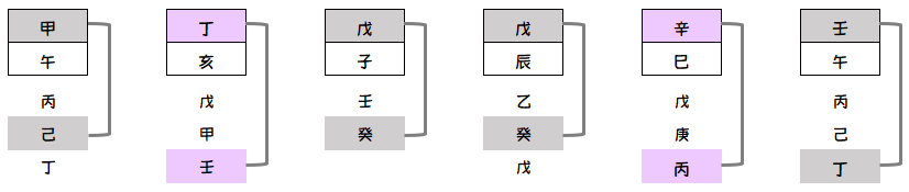 천간합은 6번째 천간을 만나서 합을 이루는데 갑목(甲)에서 6번째 천간인 기토(己)가 만나고 을목(乙)은 경금(庚)과 병화(丙)는 6번째 천간인 신금(辛)을 합하고 정화(丁)는 임수(壬)를 무토(戊)는 계수(癸)를 만나 합을 이룹니다.