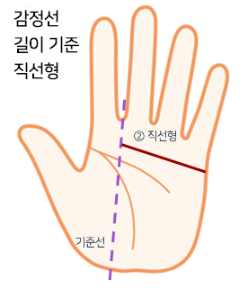 ② 직선형 감정선은 검지와 중지 사이를 기준해서 읽습니다.