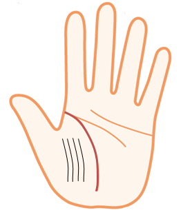 생명선의 세로선은 생명선을 강하게 만들어주며 가로선은 장해선이 되어 생명선을 약하게 합니다.