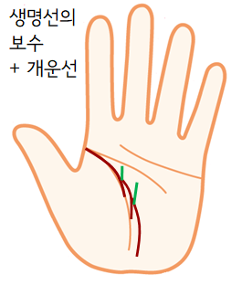 생명선을 보수해 주는 선 위로 개운선이 있으면 집안이나 배우자 또는 귀인의 금전적인 혜택을 받기 쉽습니다.