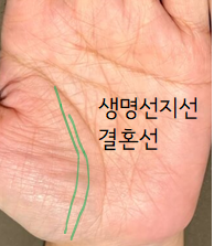 생명선 안쪽 지선 중 생명선과 가까우며 긴 지선이 일반적으로 결혼을 뜻합니다.