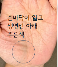 손바닥이 얇고 생명선 하단이 푸른색을 띠는데 위장이 약하고 소화불량이 자주 일어납니다.