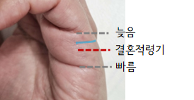 보통 결혼선은 2~3개가 있는 것이 일반적이며 그중 진하고 긴 선을 결혼의 인연으로 읽습니다.