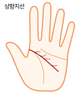 두뇌선 지선이 위로 올라가면 토성구, 태양구, 수성구를 향하므로 긍정적으로 읽습니다.