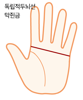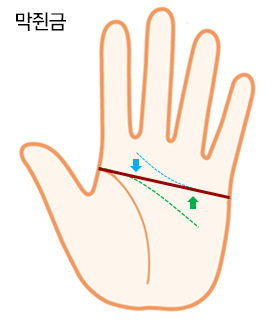 막쥔금은 원숭이 손금이라고도 불리며 감정선과 두뇌선이 합쳐진 형태입니다.