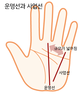 사업선은 운명선의 보조역할을 하며 사업선의 결과는 재물선으로 나타납니다.