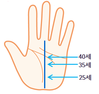 손바닥 전체를 기준으로 하여 1/2 지점이 35세, 1/4 지점이 25세 정도가 됩니다.