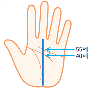 손바닥 전체를 기준으로 하여 1/2 지점이 35세, 1/4 지점이 25세 정도가 됩니다.