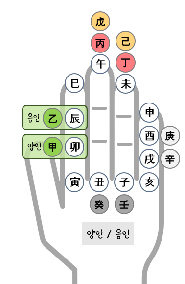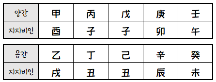 정화(丁)와 기토(己)는 사오미(巳午未)의 미토(未)가 음인, 신금(辛)은 신유술(申酉戌)의 술토(戌)가 음인이며 계수(癸)는 해자축의 축토(丑)가 음인이 됩니다.