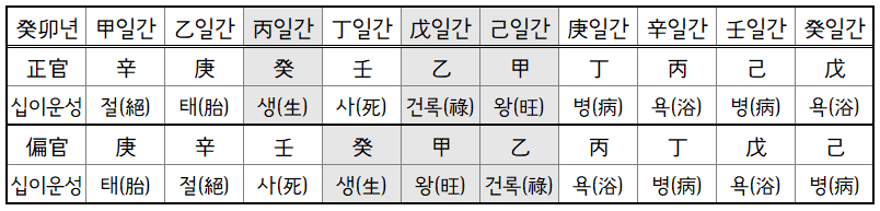 십이운성을 정관과 편관으로 확인해보면 언제 남자운이 힘을 받을지를 알 수 있습니다.