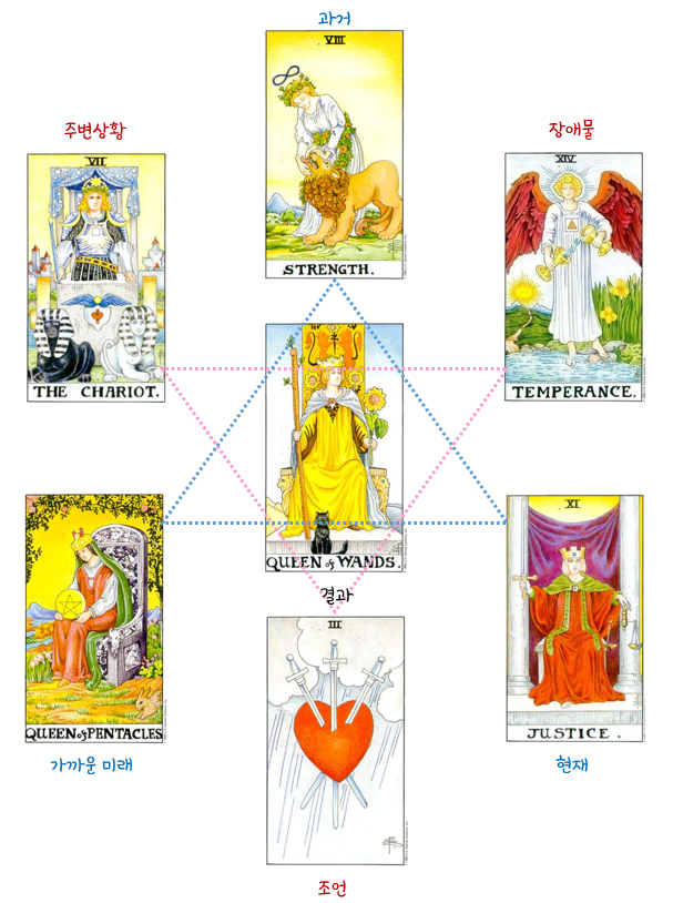 과거 - 현재 - 미래의 삼각형과 조언 - 주변 상황 - 장애물의 삼각형을 2개의 세트로 읽어야 합니다.