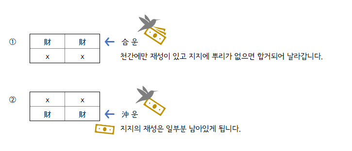 재성(財星)은 지지에 있는 것이 좋으며 충(沖)운이 와도 완전히 다 날아가지 않습니다.