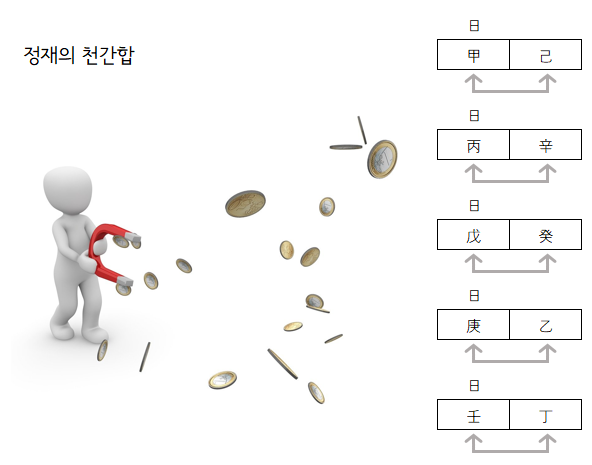 정재(正財)가 천간합(양일간)이 되면 재성이 도망 갈 수 없게 내가 꽉 쥐고 있는 것이 되어 안정성이 있습니다.