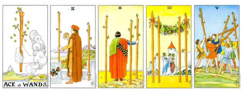 5 완드 카드의 연애운 – 경쟁자 등장, 작은 갈등, 다른 사람의 도움이 필요