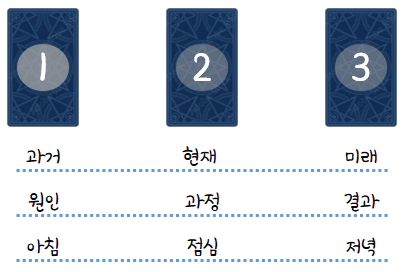 쓰리 카드 해석은 서로 연계하기 때문에 자리 별 의미를 고려해서 해석하는 것이 중요합니다.