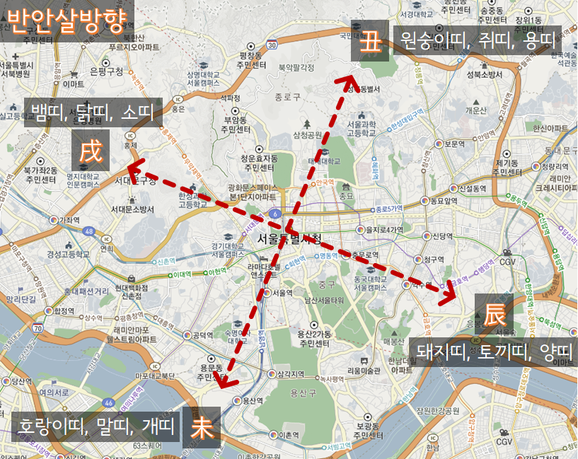서울특별시청을 기준으로 한 반안살방향의 예시입니다.