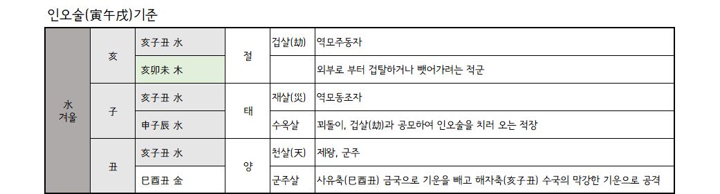 삼합의 마지막 글자의 다음 글자로 인신사해(寅申巳亥)가 되며 12 운성으로는 삼합의 대표오행의 절(絶)지가 됩니다.