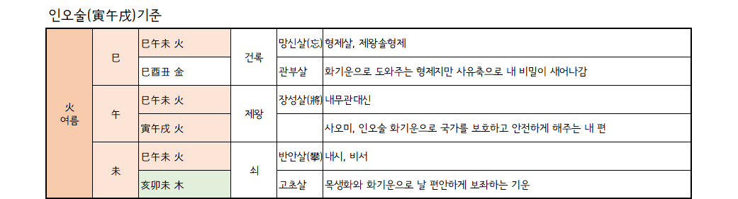 인오술(호랑이띠, 말띠, 개띠): 남쪽(午), 붉은색 계열