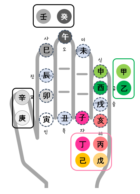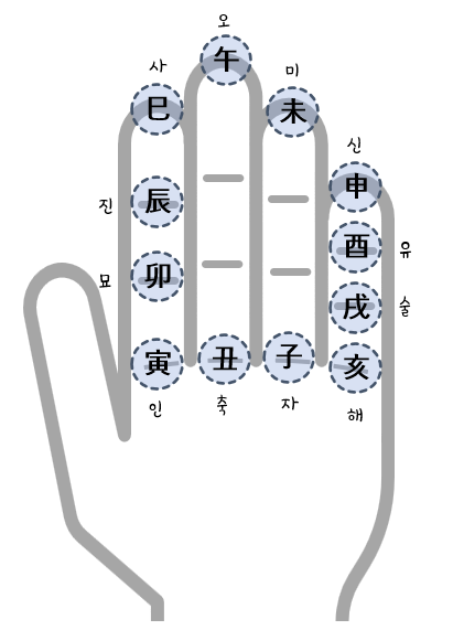 왼손 엄지손가락으로 12지지가 위치한 마디를 짚으면 되는데 순행은 시계방향으로 돌리고 역행은 시계 반대방향으로 짚어나가면 됩니다.