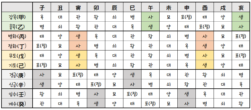천간의 기운이 지지로 내려와 기운이 태어나고 자라서 전성기를 맞이하고 쇠하고 약해져서 죽고 기운이 끊어지고 다시 태어나는 관계를 표현한 것입니다.