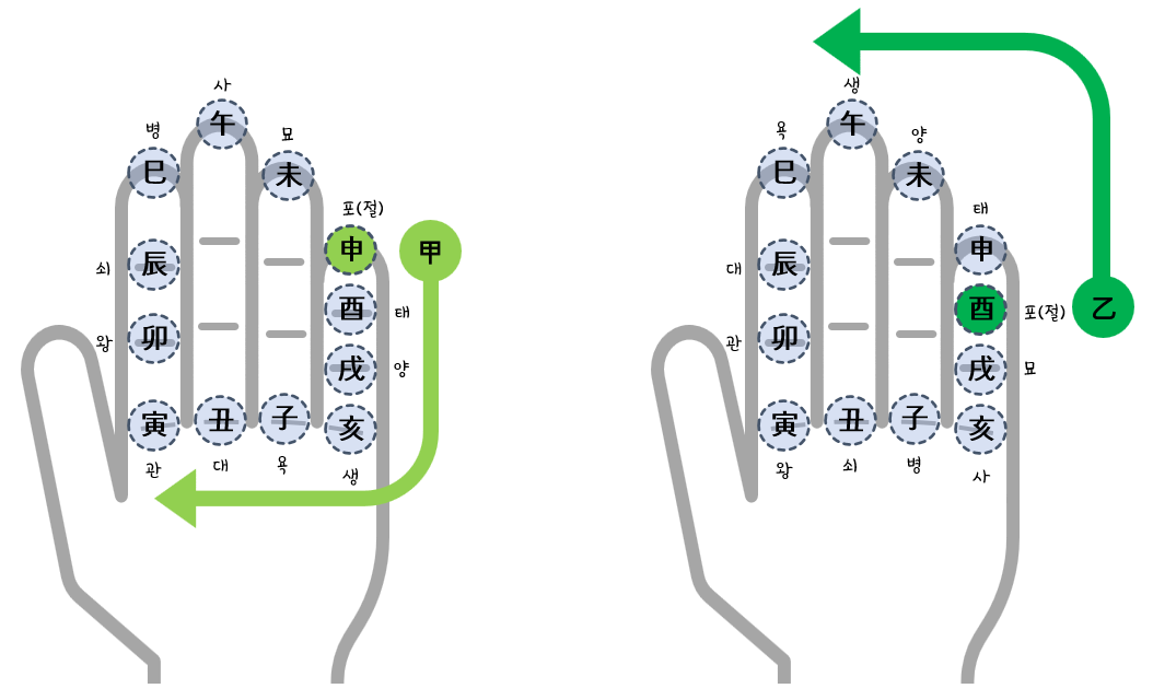 손가락위치를 확실히 암기해 놓으면 십이운성과 십이신살 붙이는데 엄청 편한 방법이 되겠습니다.